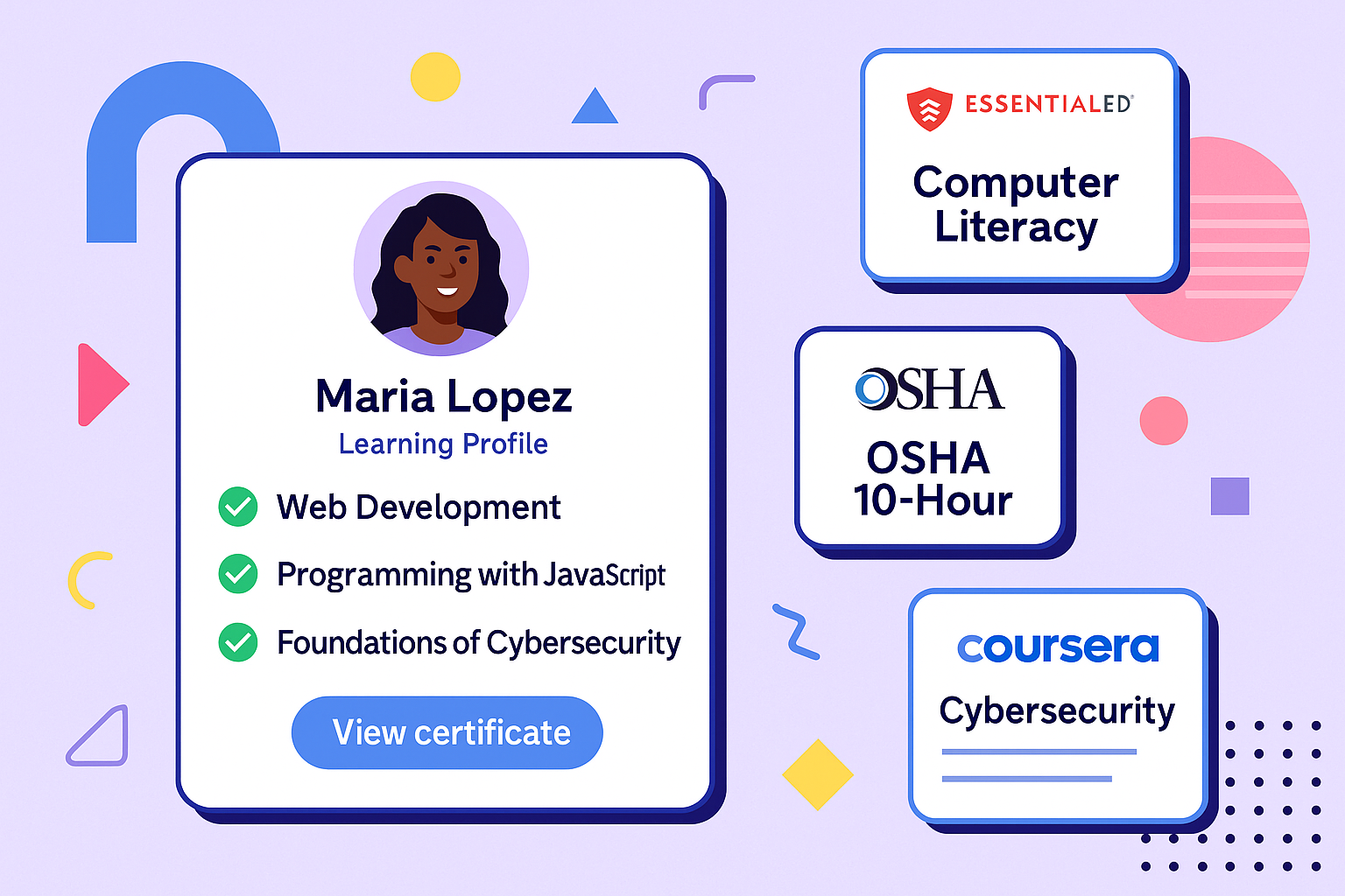 Learners continue adding certificates from other providers, building a lifelong record of progress. They control who sees it, and can share with employers, colleges, agencies, or community organizations. For institutions, the profile delivers real-time visibility into outcomes while preserving learner ownership.